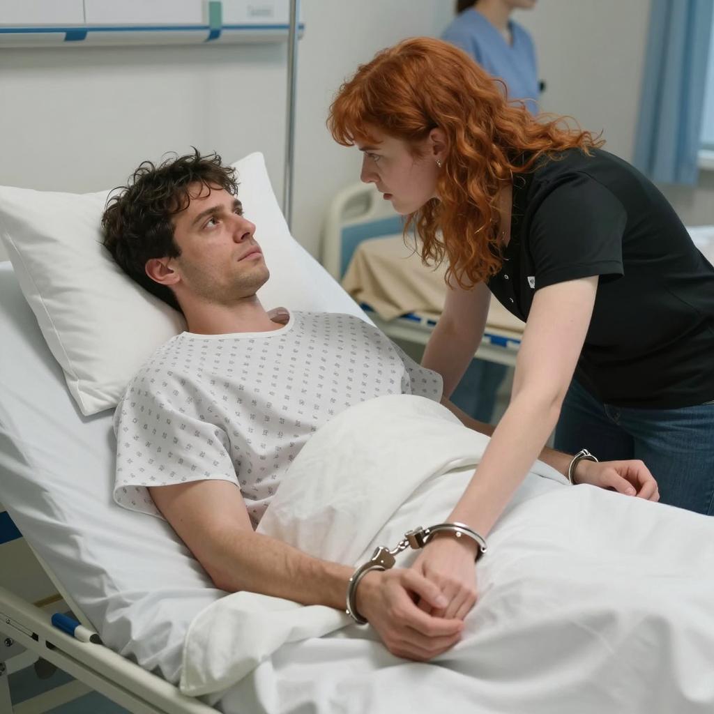 A hospital room. A man with short dark hair and a white hospital gown lies in a metal bed, restrained with handcuffs. A woman with red hair and a black top leans over him, holding his wrist. He looks up at her. The bed has a white blanket, and a beige sheet is on another bed in the background. The woman's expression is intense. Two people.