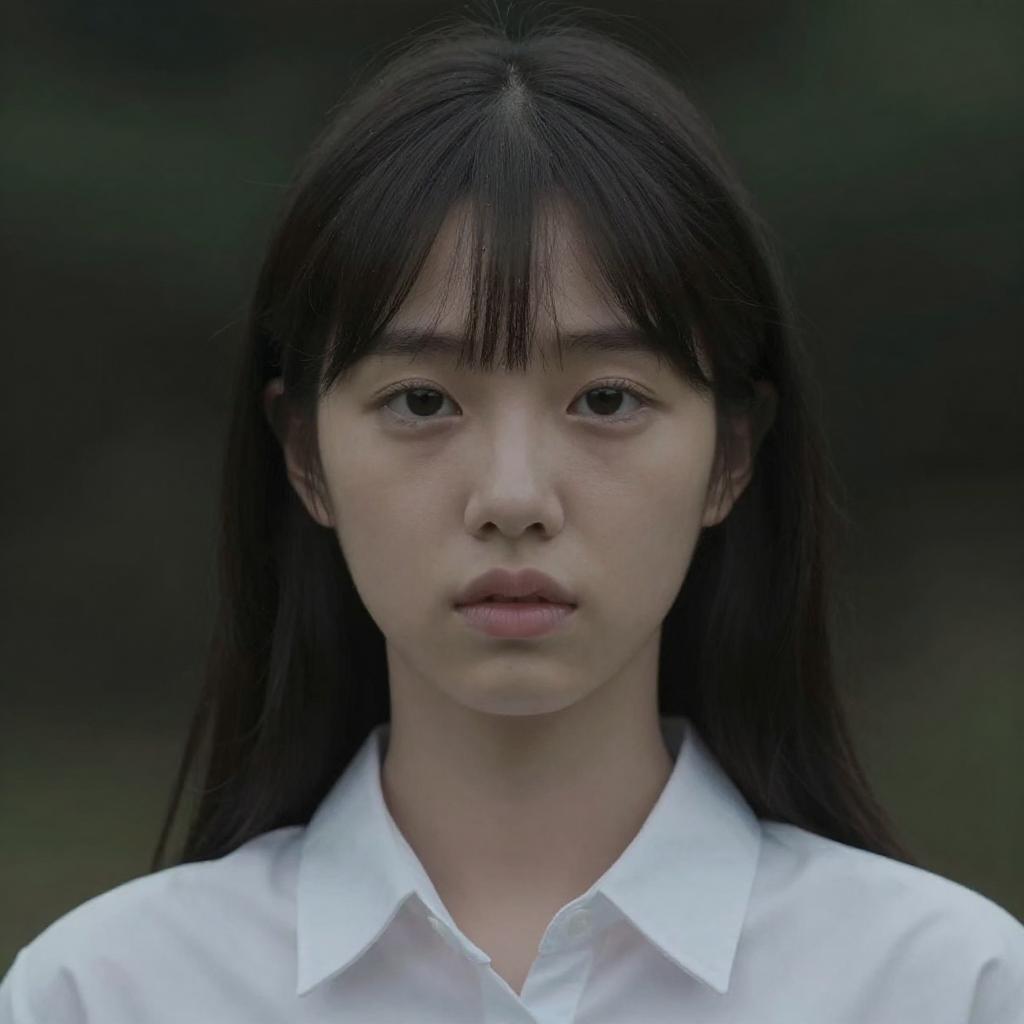 Masterpiece, best quality, (dark photo:1.3), photorealistic, 1girl, flat bangs, stunning innocent symmetry face, shirt, emotional, ulzzang, (PureErosFace_V1:0.7)