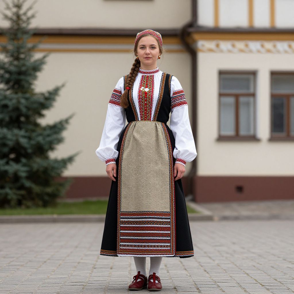 Slavic Costume, woman in a traditional dress standing in front of a building