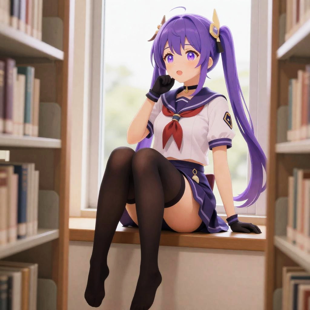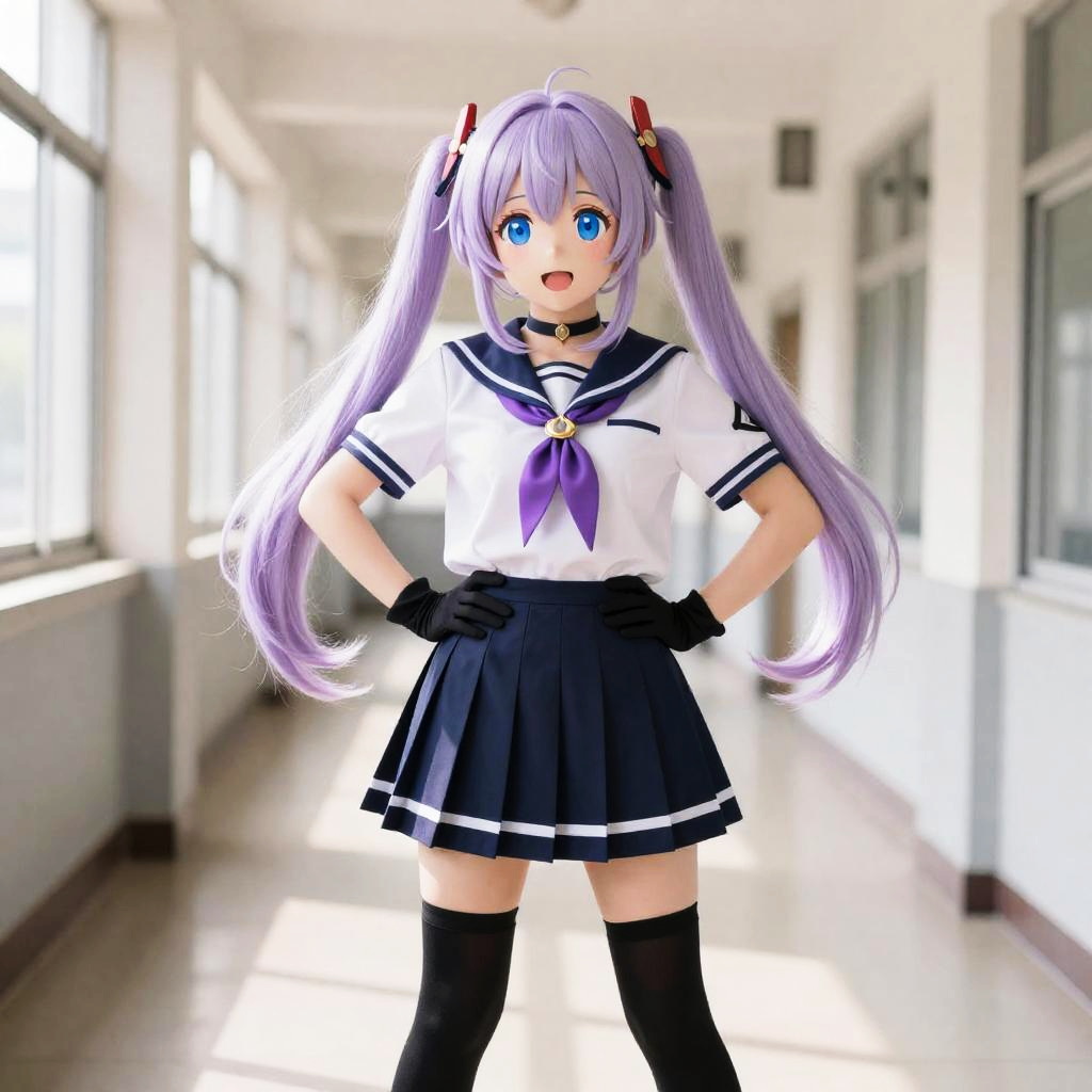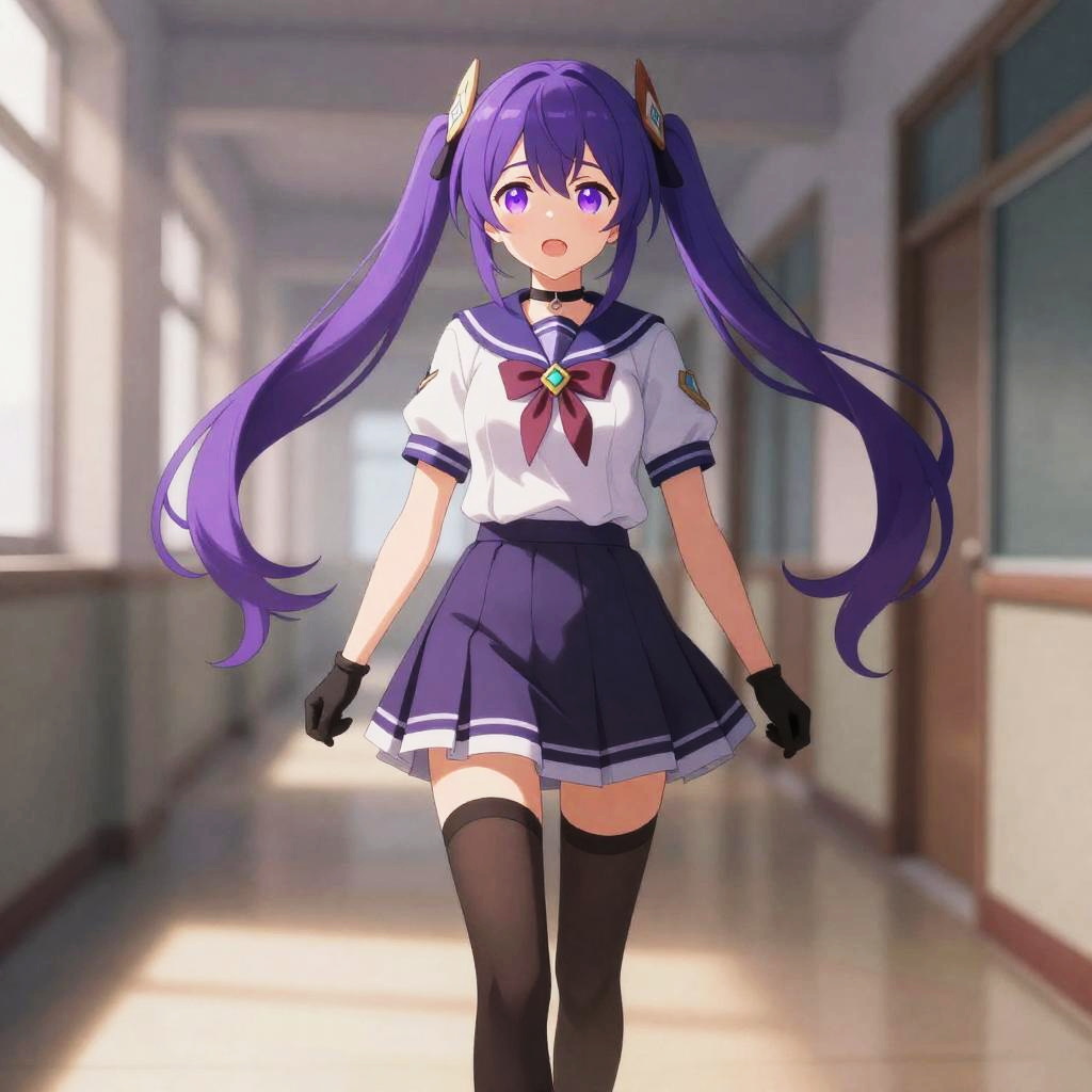 Full body, aether genshin impact, 1girl, purple hair, twin tails, purple eyes, face blush, open mouth, school uniform, serafuku, choker, purple choker, neckerchief, short sleeves, skirt, black thighhighs, gloves, hair ornament, vibrant colors, anime influenced, cheerful, school rooftop garden, bright daylight, sitting on ledge with legs dangling