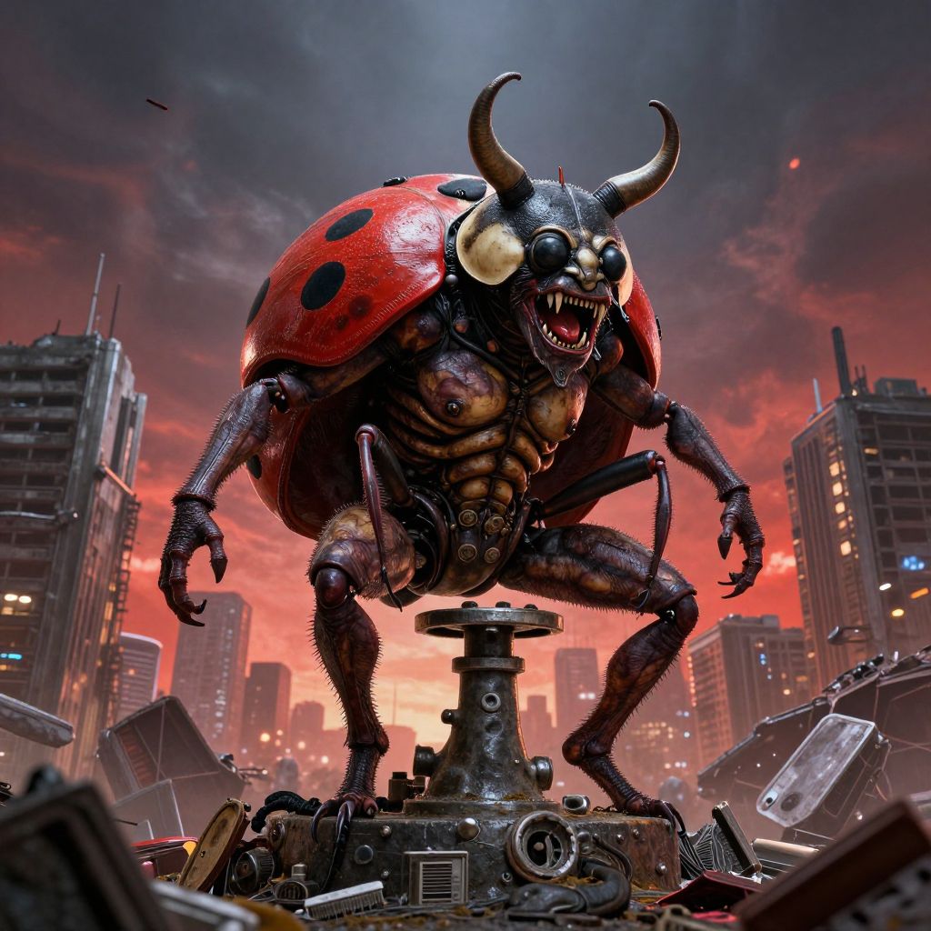 Valve a giant demon mixed with ladybug and human standing triumphantly in a post apocalyptic city, contrasted colors, super detailed, epic, hyper realistic,