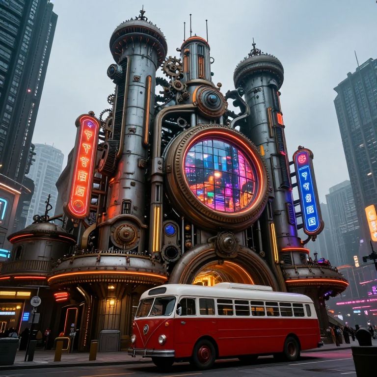 In the heart of an atompunk metropolis, a futuristic, steampunk-inspired building stands as a testament to the convergence of technology and fantasy. The structure, adorned with intricate mechanical details and glowing neon signs, dominates the scene. Its large, circular windows reflect the city's vibrant life, while the towering, cylindrical shapes and complex gears hint at advanced engineering. A vintage, red and white bus, reminiscent of early 20th-century designs, is parked in front, adding a touch of nostalgia to the otherwise futuristic setting. The neon lights, in hues of orange and blue, illuminate the scene, casting a warm glow that contrasts with the cool, metallic tones of the building. The cityscape in the background, with its tall, dark buildings and overcast sky, creates a sense of depth and scale, emphasizing the grandeur of the central structure. The overall composition is dynamic, with elements interacting in a harmonious yet complex manner, reflecting the intricate balance between the old and the new in this atompunk metropolis.