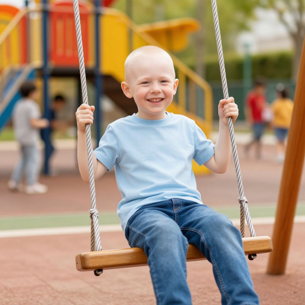 Bald white kid smiling joyfully, sitting on a wooden swing in a colorful playground, vibrant background with other children playing, high detail