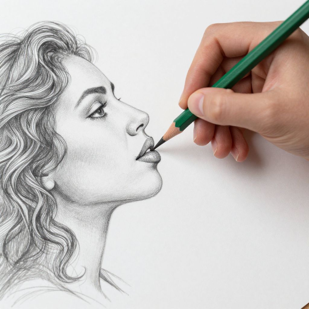 A detailed, black-and-white pencil sketch of a woman's profile with wavy hair, shown in mid-pencil drawing. Her eyes are slightly upturned, and she has a calm expression. A hand holds a green pencil, poised to add more detail to her lips. The background is plain white, emphasizing the sketch. The pencil's tip is close to her mouth, suggesting the artist's focus on her lips. The image captures the process of creating the drawing, blending realistic shading with delicate line work.