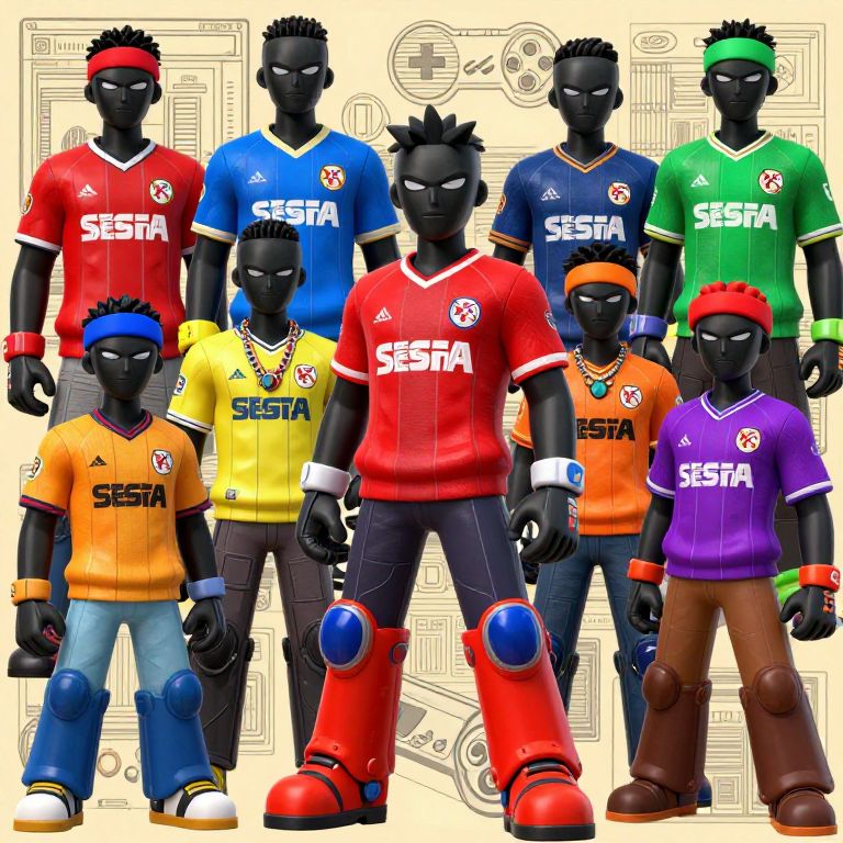 The image is a collage-style artwork with a 2000s mecha theme, featuring animated black characters wearing soccer jerseys and adorned with various accessories like jewelry and headbands. The characters are posed in urban clothing, with a collage layout that includes a template diagram of a Sega 95-style work. The scene is set against a warm, vibrant color palette, reminiscent of street fashion, with a retro backdrop feel. The portrait is Japanese, rendered in photorealistic high quality, with a cinematic style. The image is a high-resolution 4k 8k quality SVG, with elements like a retro game controller and a Metroid-like design. The characters are depicted in a Metroid style, using primary colors such as Torch Red, Royal Blue, Prime Green, Yellow Orange, and Purple. The overall composition is dynamic, with elements arranged in a complex interplay of shapes, textures, and colors, creating a visually rich and structured scene.