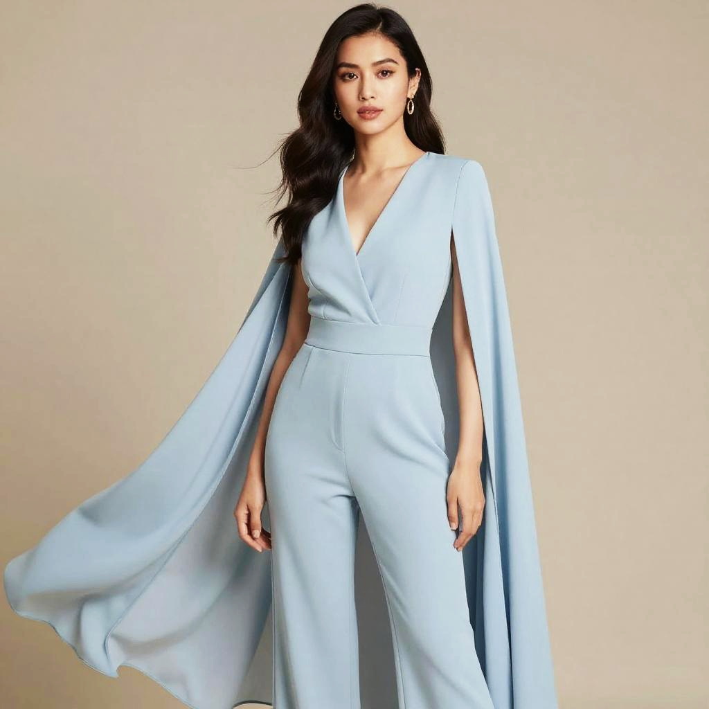 A stylish woman poses confidently dressed in an elegant pastel blue jumpsuit with a deep V neckline and matching flowing cape. The soft lighting highlights her poised expression and sophisticated fashion sense, complemented by delicate gold earrings.