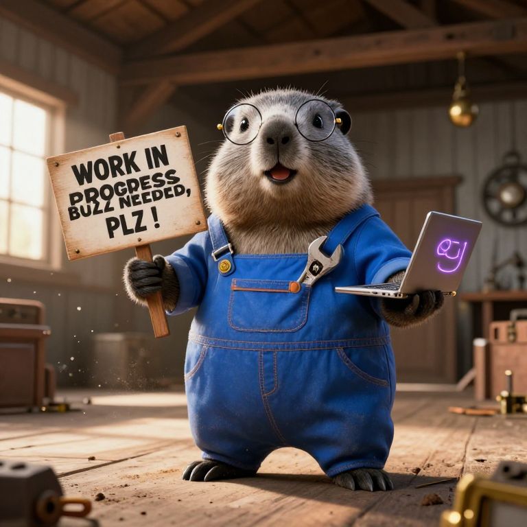 A digital illustration of a cute, chubby groundhog standing on a wooden workbench in a sunlit, rustic workshop. The groundhog wears blue denim overalls, round glasses, and holds a sign reading "WORK IN PROGRESS, BIGGER NEEDS PLZ!" in black letters. In its other hand, it holds a small, glowing purple laptop. The background features wooden walls, a window letting in sunlight, and various workshop tools. The texture is smooth with realistic lighting, emphasizing the friendly and industrious character. The style is whimsical and cartoonish.