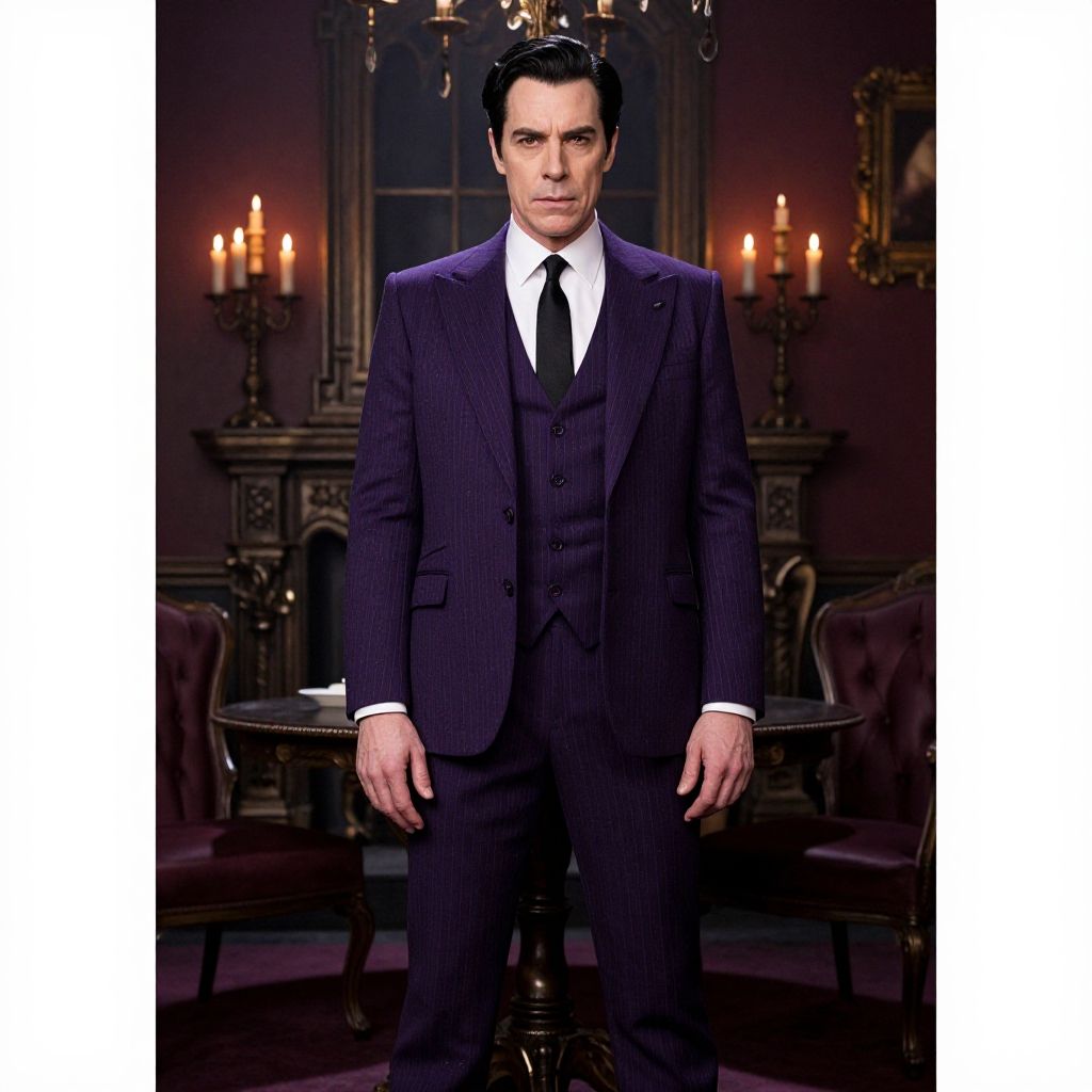 Gomez Addams purple suit, a charismatic man in a deep purple tailored suit with pinstripes, confidently standing in a gothic Victorian mansion, dim candlelight casting shadows, vintage decor, mysterious and elegant atmosphere, cinematic style