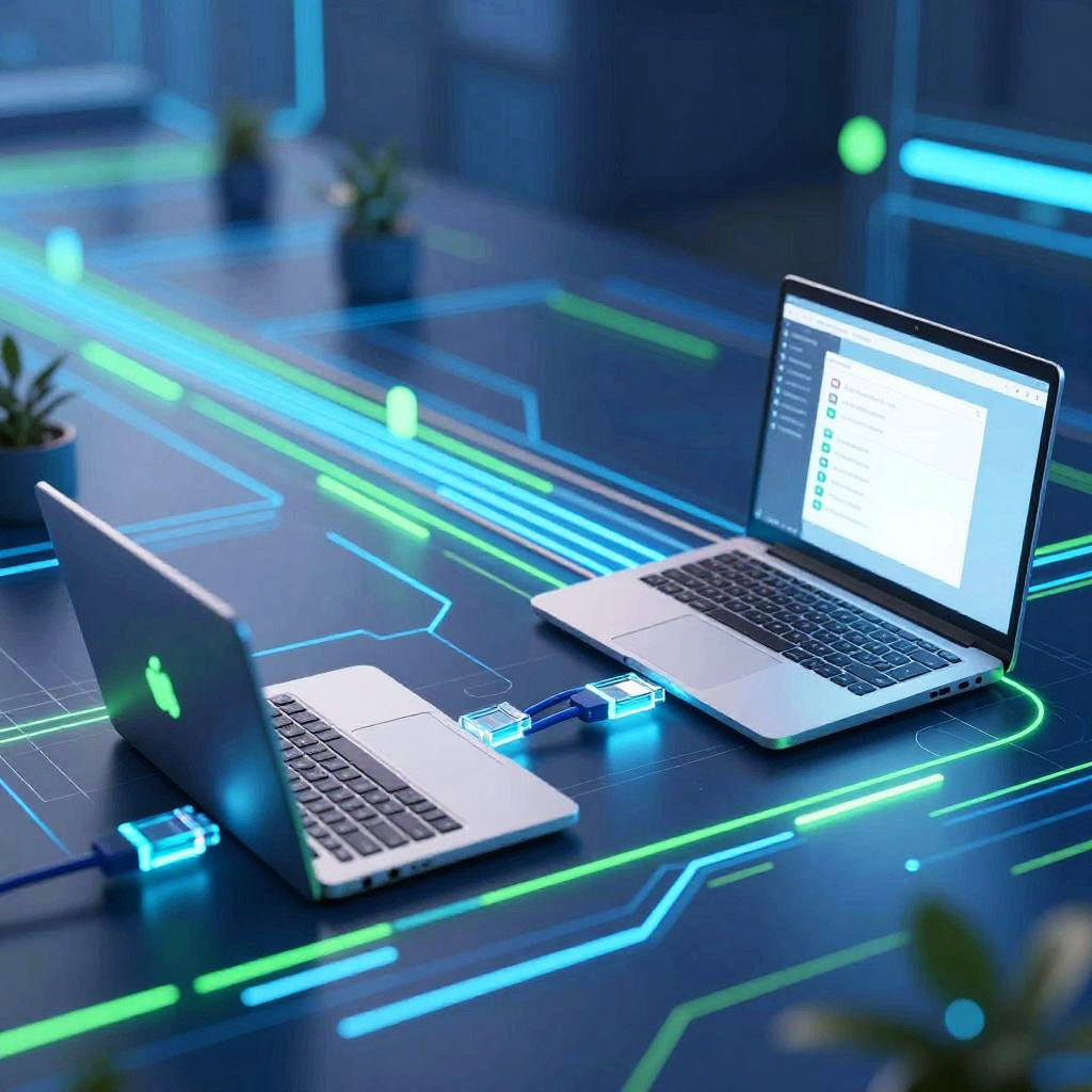 Anydesk remote desktop visualization, a dynamic scene showing two laptops connected over a vibrant data stream, glowing network cables intertwining, bright blue and green neon lights, abstract tech background, futuristic communication technology, high resolution digital art