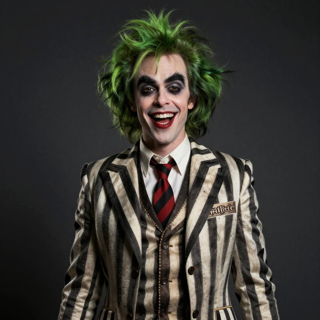 Beetlejuice Character, man dressed in a suit and tie with a green mohawk