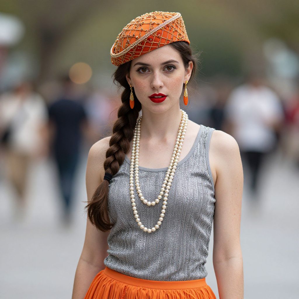 Photograph of a fair-skinned woman with dark brown hair in a long braid, wearing an orange, beaded, small-brimmed hat. She has striking red lipstick, orange drop earrings, and a long pearl necklace. Her sleeveless, gray, textured top contrasts with an orange, high-waisted, fringed skirt. The blurred background shows an outdoor setting with indistinct people, suggesting a public space or event. The overall style is vintage with a modern twist, combining bright, bold colors and classic accessories. The lighting is natural, highlighting her features and outfit.