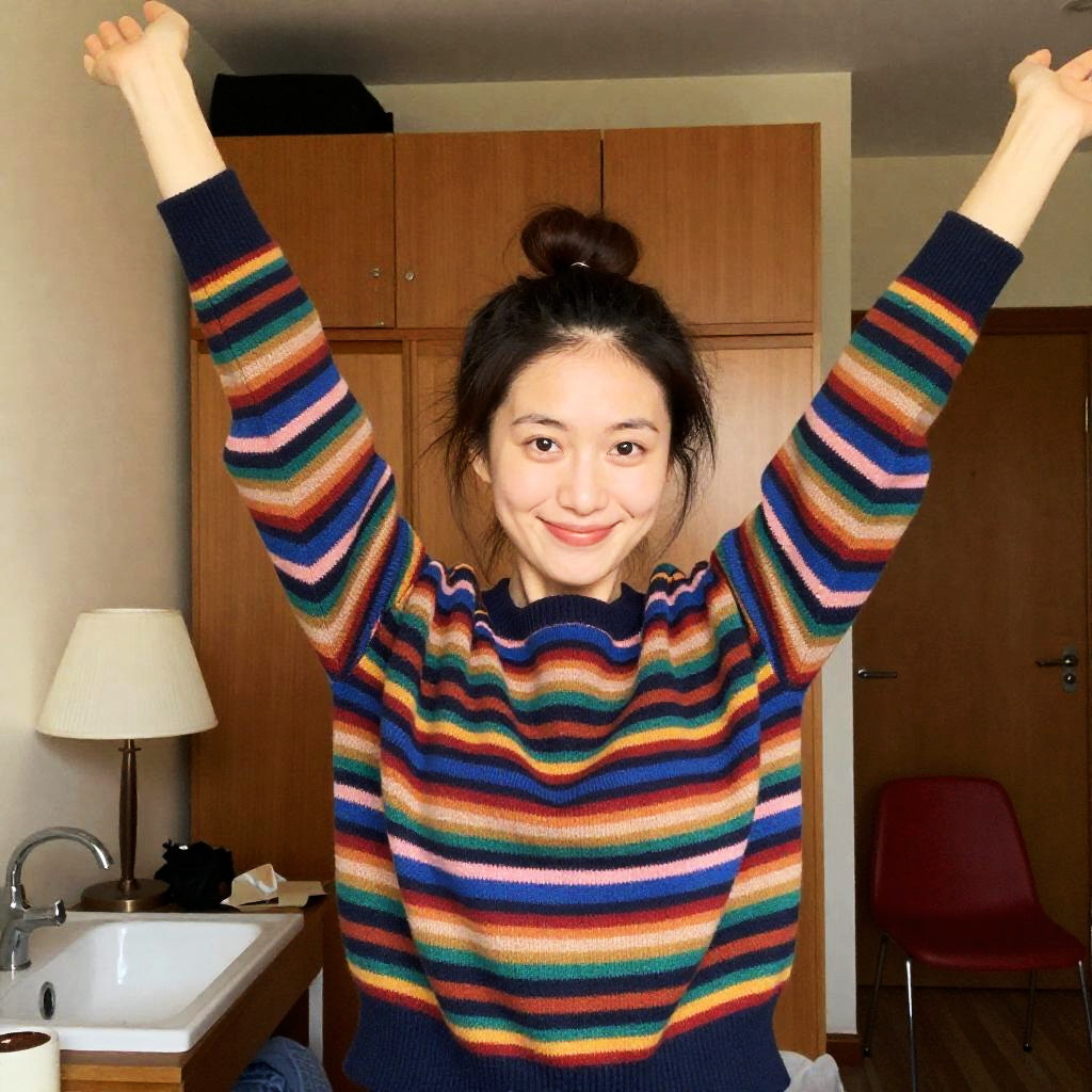 Woman with dark hair in a bun, wearing a colorful striped sweater with geometric patterns, arms raised, smiling. Indoor room with wooden cabinets, lamp, sink, and red chair in background. Warm lighting, slightly cluttered space.
