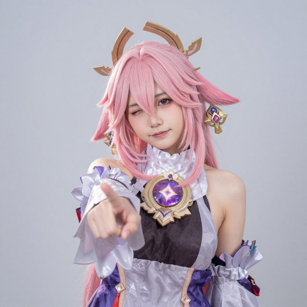 Photograph of a person with light blue, wavy hair and white horns, wearing a white and blue costume with gold accents. They are smiling, winking, and pointing forward with their right index finger. The background is a gradient of light blue to white. The costume has intricate patterns and a sleeveless design.