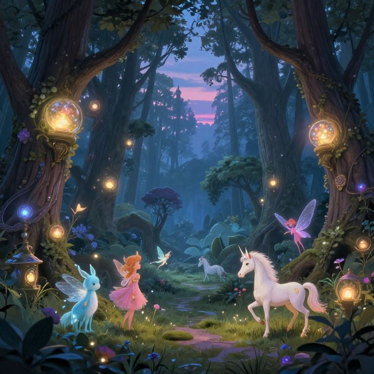 Fantasy art images depicting a mystical forest at twilight, illuminated by glowing magical orbs, with ethereal creatures like fairies and unicorns roaming the enchanted landscape, intricate details, vibrant colors, high fantasy style.