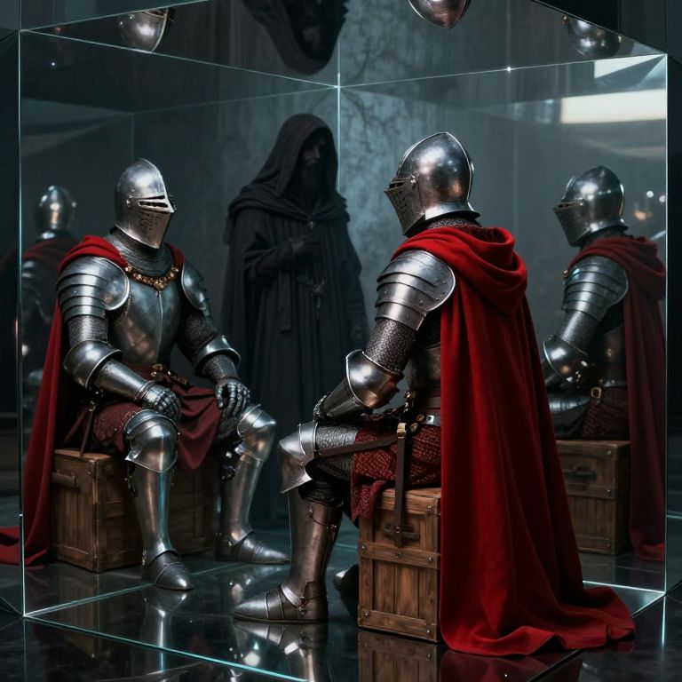A medieval knight clad in gleaming armor and draped in a vibrant red cape sits contemplatively on a wooden crate within a mirrored cube, his reflection multiplied endlessly, as he faces a mysterious cloaked figure whose form shifts and merges with the shadows, creating a surreal and enigmatic tableau rendered in high-definition digital art with dramatic lighting effects.