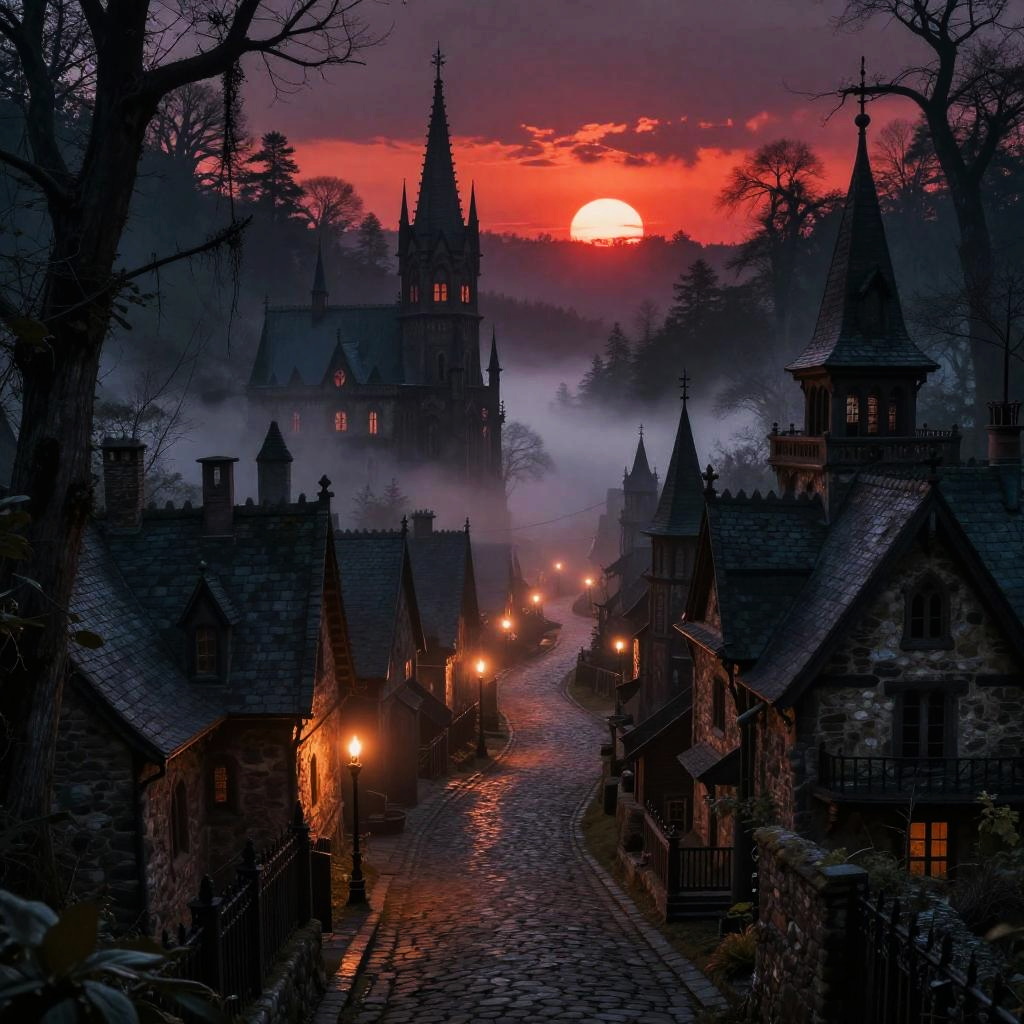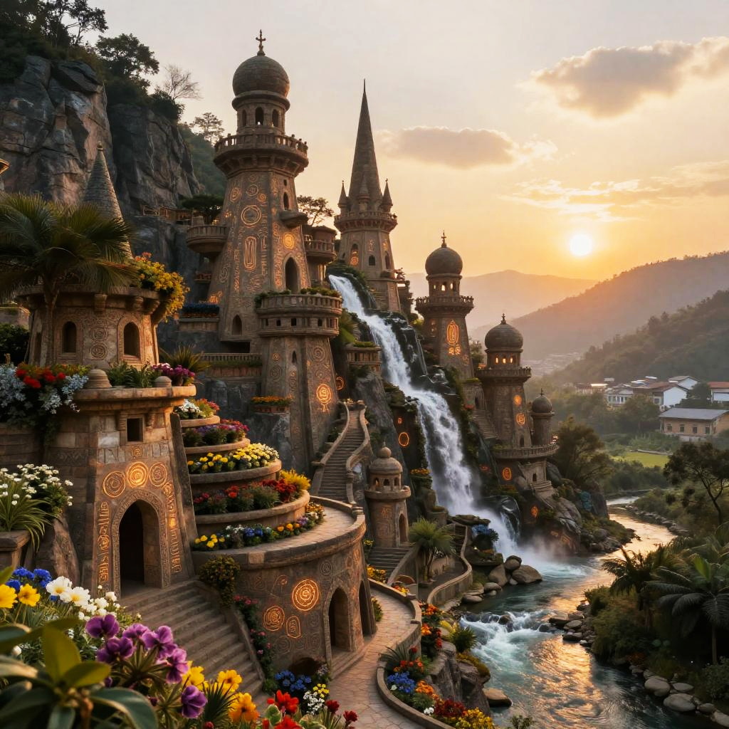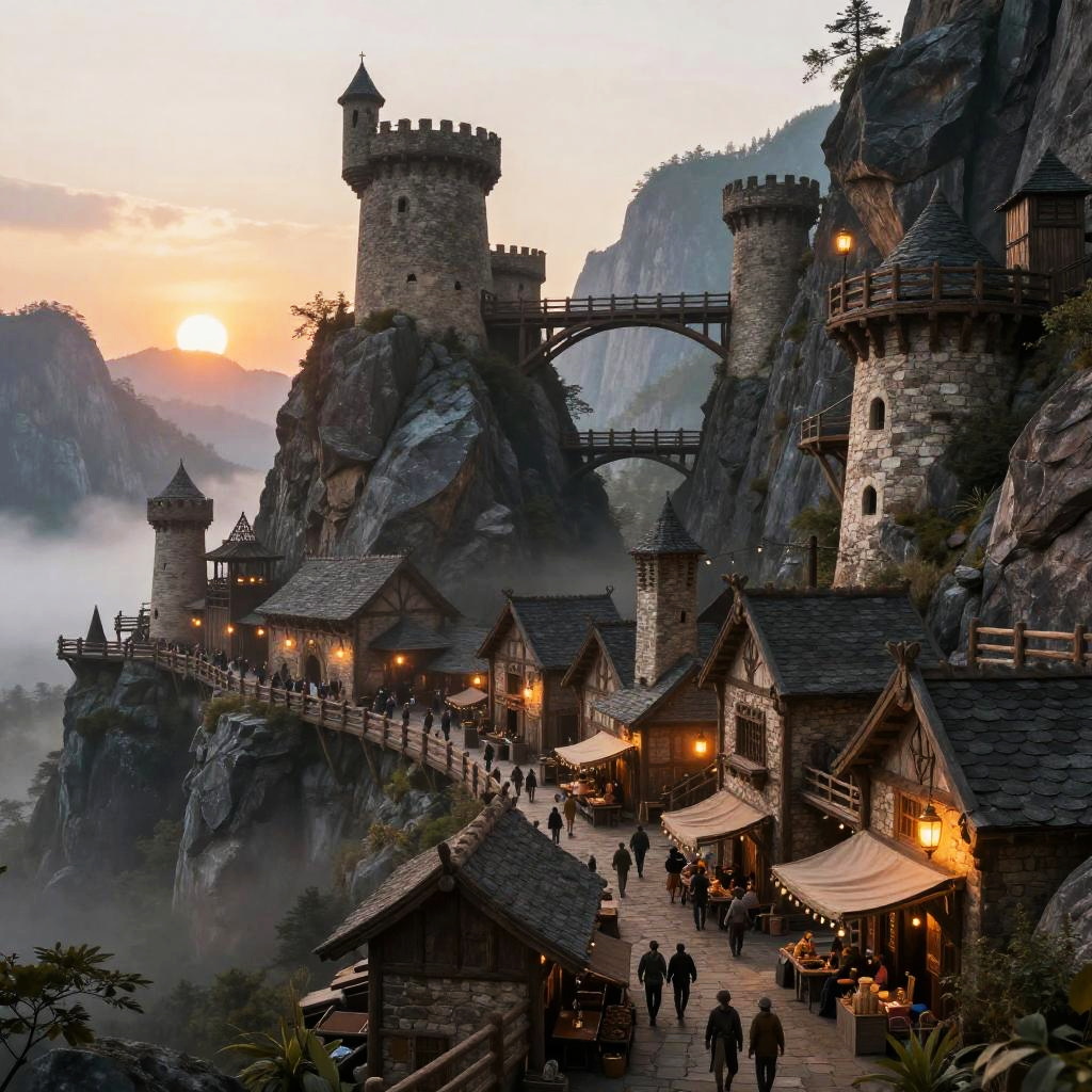 Fantastical medieval village nestled on rocky cliffs, featuring stone towers, wooden houses, lanterns, and a bridge at sunset. People walk along a
