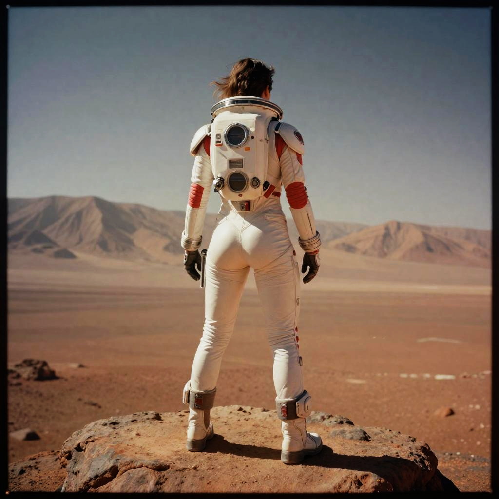 A futuristic rear angle (sci-fi) photo of a (fit woman futuristic astronaut standing on rock overlooking Martian valley on Mars), back towards viewer, not looking at viewer, (wearing skintight white and red sci-fi spacesuit, full body), fit body, (big ass), [wide hips], rusty red Martian terrain, mars dust scattered floating in air, (mountain:0.8), (lens flare:0.7), (cross-processing), (highly detailed), (cinematic lighting:1.1), sharp shadows, intricately detailed, photographed on a Hasselblad 500, 80mm F2.8 lens, with Cinestill 800T film, cinematic contrast, outdoors, ((on Mars)), space exploration, journey, nasa-punk, from behind, sfw, in lomostyle