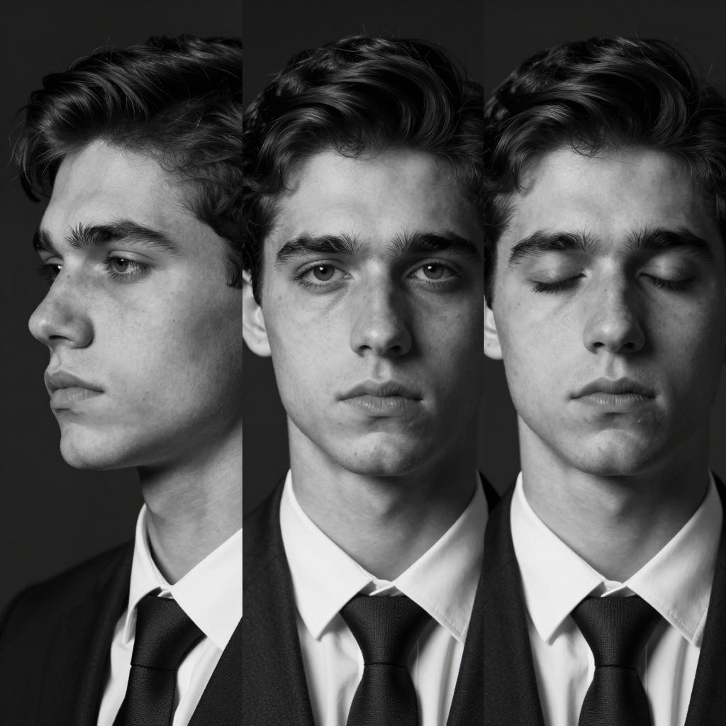 Hand holding magnifying glass over monochrome photograph of a person with dark hair and intense expression. Background is densely packed on paper. Magnifying glass reveals detailed facial features. Hand has light skin and is positioned on the left.