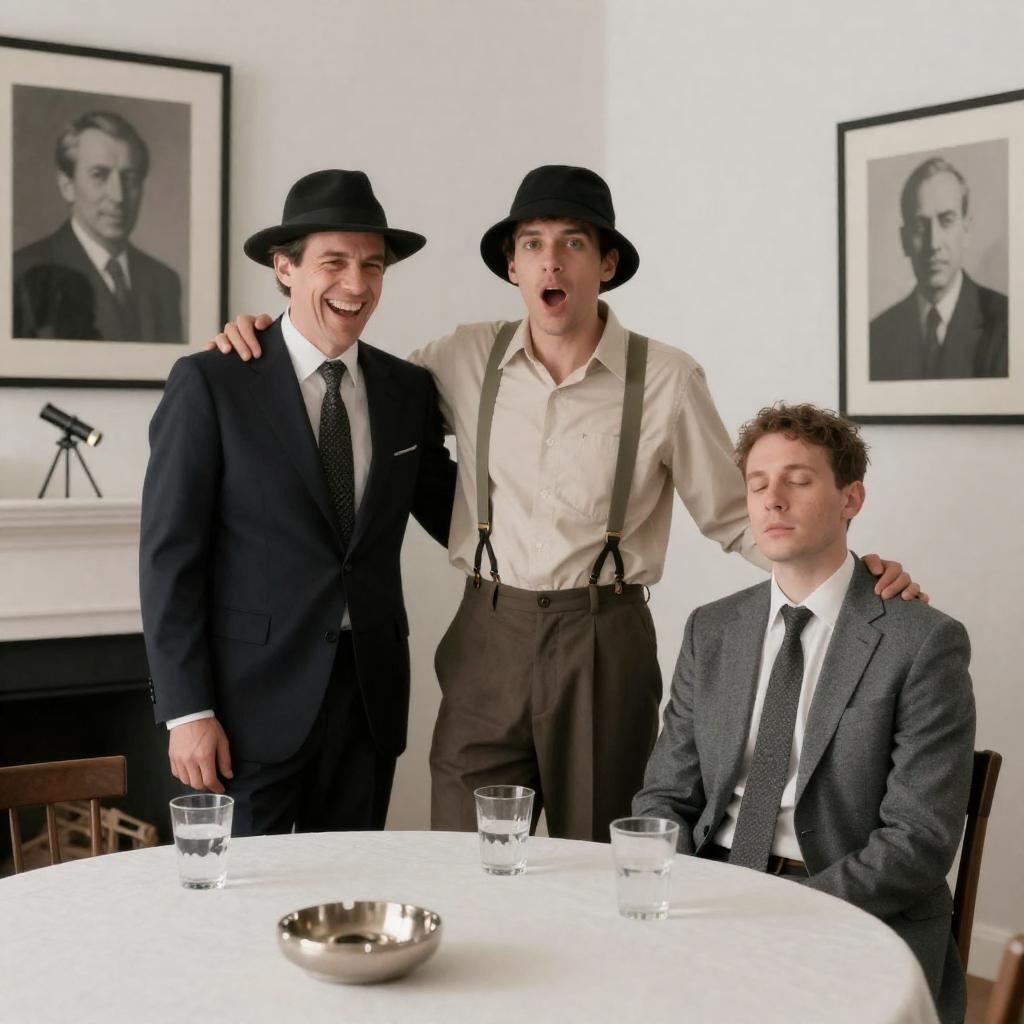 Three Caucasian men in vintage-style clothing inside a classic room. The man in the center stands with an open mouth, wearing a beige shirt, olive suspenders, and a black bucket hat. The man on the left, dressed in a dark suit, white shirt, patterned tie, and black fedora hat, is laughing with his arm around the central man. The man on the right is sitting with eyes closed, wearing a gray suit, white shirt, and tie. They are around a round table covered with a white tablecloth, which has three glasses of water and a metal ashtray. The background features white walls with two framed black-and-white portraits, a telescope on a fireplace mantel, and wooden chairs.