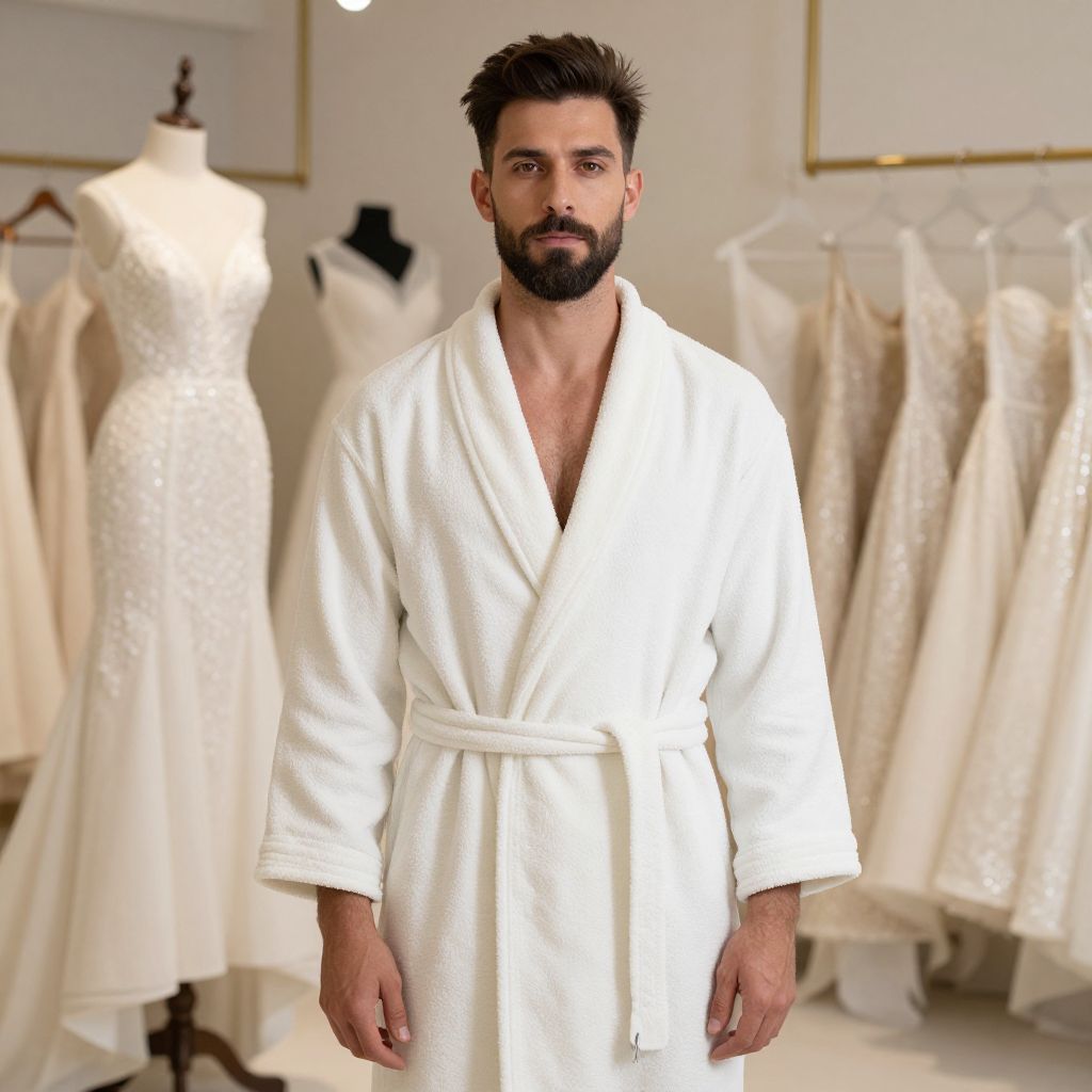 Photograph of a bearded, dark-haired man with a medium build, wearing a white, textured, bathrobe-style robe, standing in a bright, modern bridal dress store. The background features several white, lace dresses on mannequins and dress forms, hanging on white racks against a white wall. The man's robe is tied at the waist, and he has a serious expression, looking directly at the camera. The overall scene is well-lit, with a clean, minimalist aesthetic.