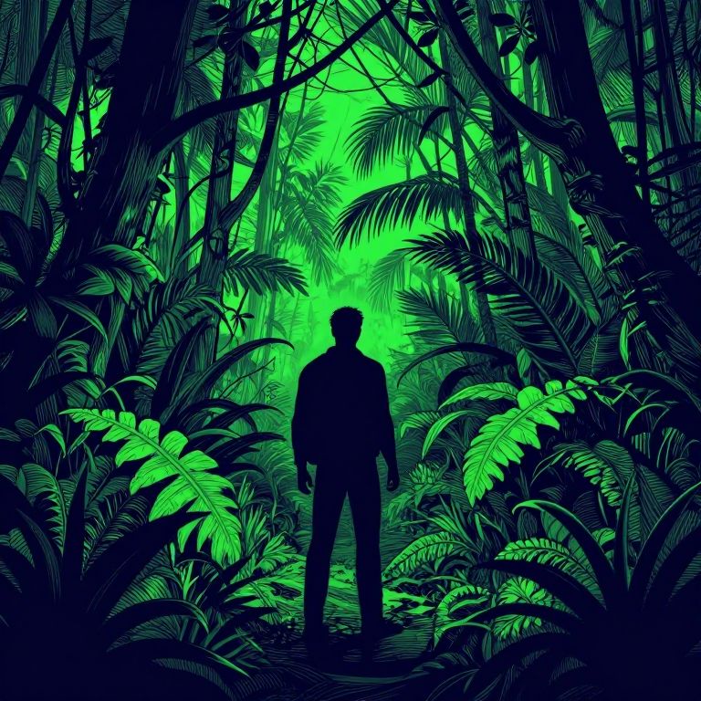 Silhouetted man stands in glowing green jungle, surrounded by dense, dark foliage in digital art style. Bright green light filters through leaves, creating