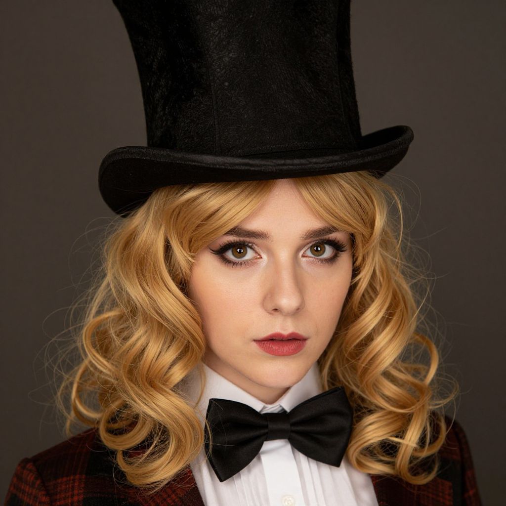 "mischievous mad hatter girl, solo, hat, top hat, 1girl, crossed arms, blonde hair, long hair, dress, drill hair, blurry background, realistic, bow Realistic photo of casual sexy person with pretty face"