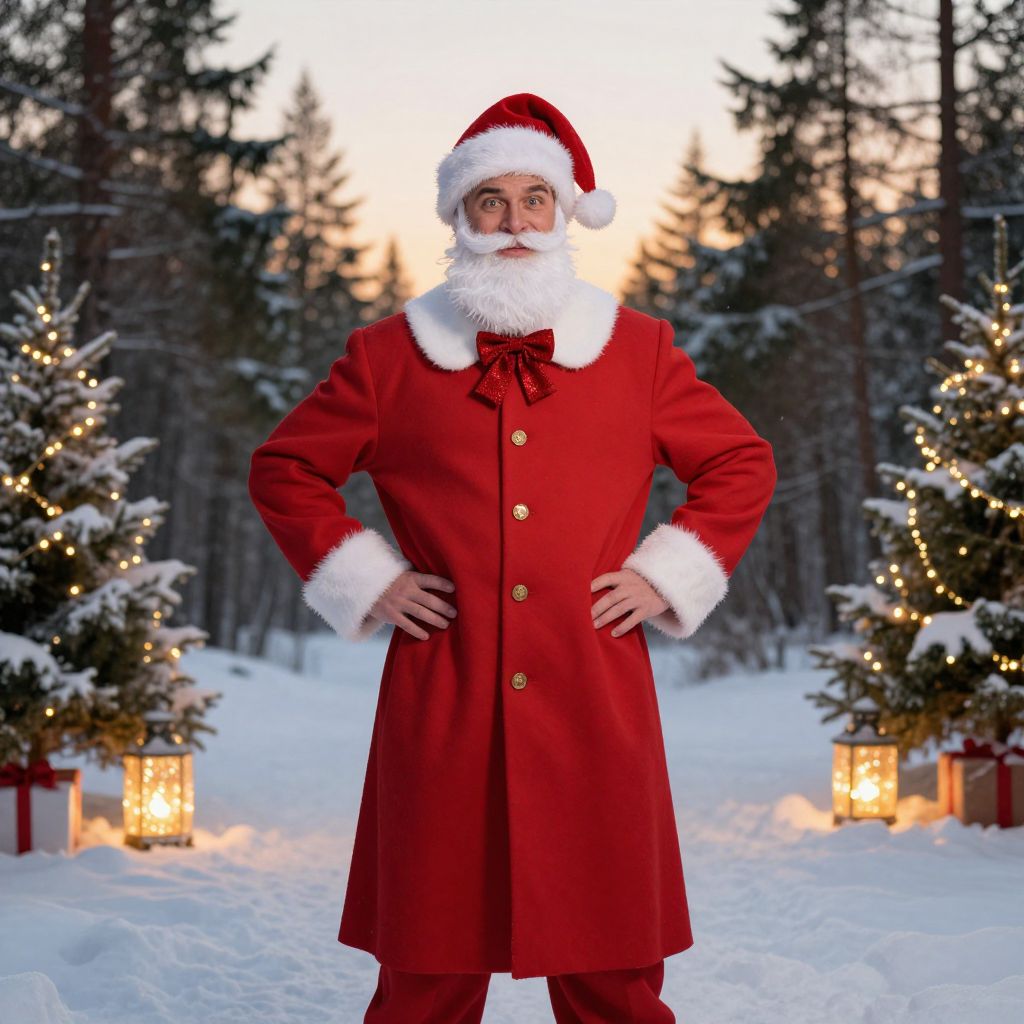A tall, well-dressed male stands in a winter landscape, wearing a red coat with a crisp white collar, a red Santa hat adorned with a white beard and a shiny red bow, his hands resting on his hips as he looks confidently into the camera. He has a warm, friendly expression with a slightly amused smile, his eyes glowing with holiday cheer. The scene is set in a serene snowy forest clearing, with pine trees silhouetted against a soft, golden twilight sky. The soft glow of winter lights—glittering lanterns, glowing Christmas trees, and twinkling strings—reflects off the fresh, snow-covered ground, creating a warm and festive atmosphere. The composition captures a blend of classic holiday charm and timeless elegance, evoking nostalgia and joy during the winter season.