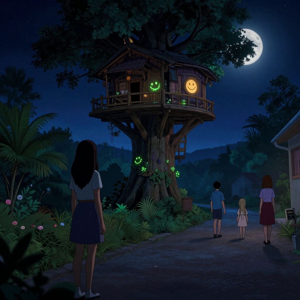 1girl, (designed by Gerard Sekoto:1.3) and (Shinji Aramaki:1.1) and (Jarek Kubicki:0.8) and (Kahlil Gibran:0.7), detailed Renderman, Rule of Thirds, cinematic shot of a ("The Smiley Face":1.3), it is very Bioluminescent and [Macho|Visual], Airy Treehouse in background, lush street with Ash, Moon in the night, Wide view, Visual novel, Wonder, Shin Hanga, side light, 50mm, Film grain, Cross Processing, triadic, masterpiece, beautiful