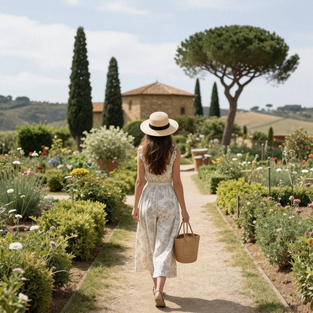 Photograph of a woman with long brown hair, wearing a white sundress and wide-brimmed straw hat, walking away on a gravel path through a lush, colorful garden. She carries a woven basket in her right hand. The garden is filled with blooming flowers, green shrubs, and tall cypress trees. In the background, there is a rustic stone building with a red-tiled roof, partially obscured by trees. The sky is clear and blue, suggesting a sunny day. The scene evokes a peaceful, Mediterranean countryside.