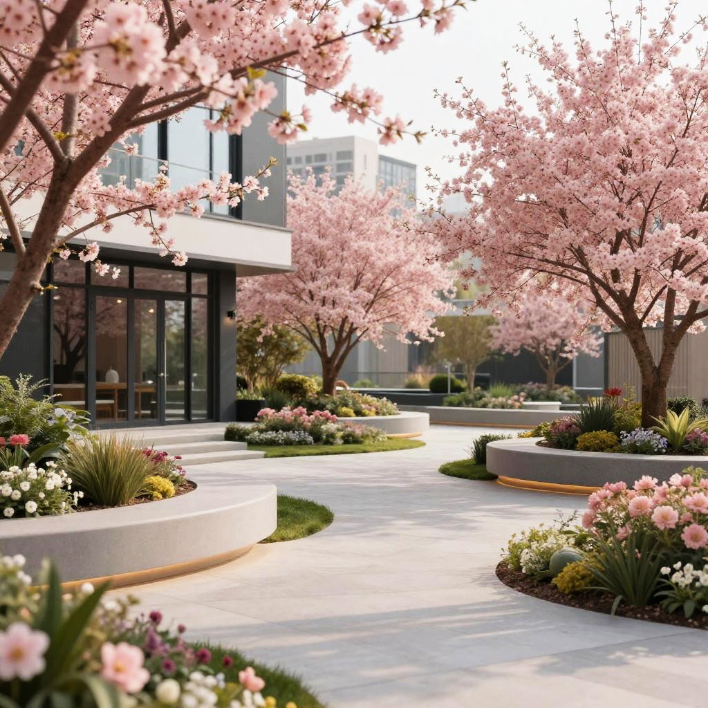 ((Best quality)), ((masterpiece)), ((realistic)), modern landscape garden, spring, pink theme