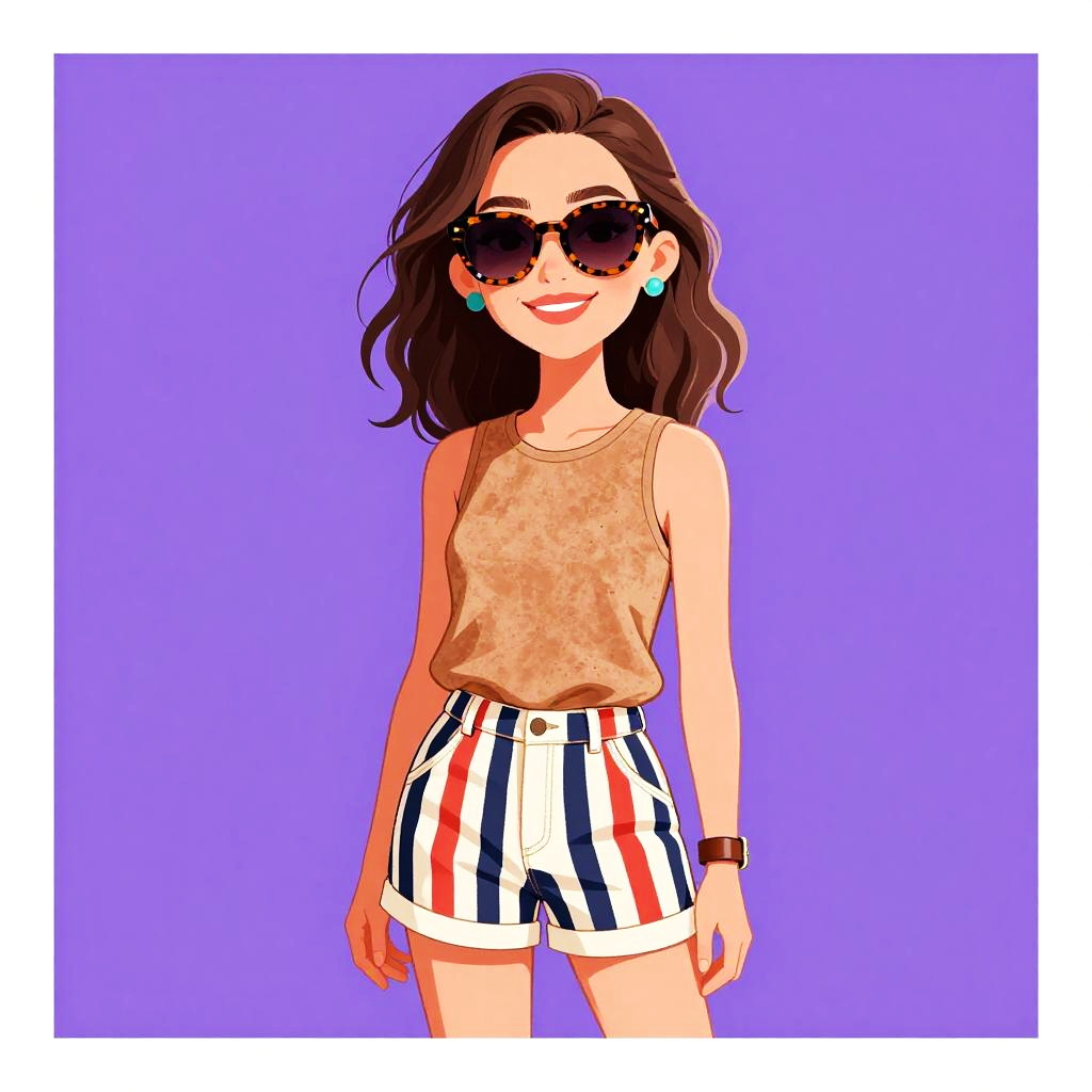 This digital illustration features a smiling woman with wavy brown hair, wearing large black sunglasses, a sleeveless, peach-colored, patterned top, and high-waisted shorts with vertical navy, white, and red stripes. She accessorizes with turquoise drop earrings and a black wristwatch. The background is a solid lavender color, enclosed in a white border. The art style is vibrant and cartoonish, with bold colors and clean lines, emphasizing a modern, stylish look.