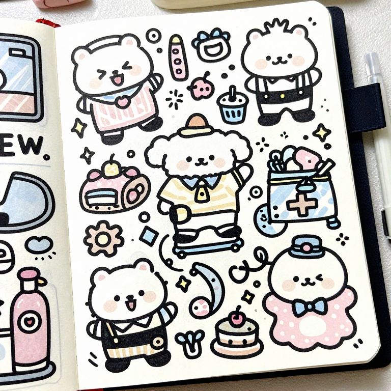 Doddles illustration featuring cute characters and quirky objects, intricate patterns combined with freeform sketching, soft pastel palette with bold black outlines, energetic and fun urban notebook style, chaotic yet charming hand-crafted doodle artwork