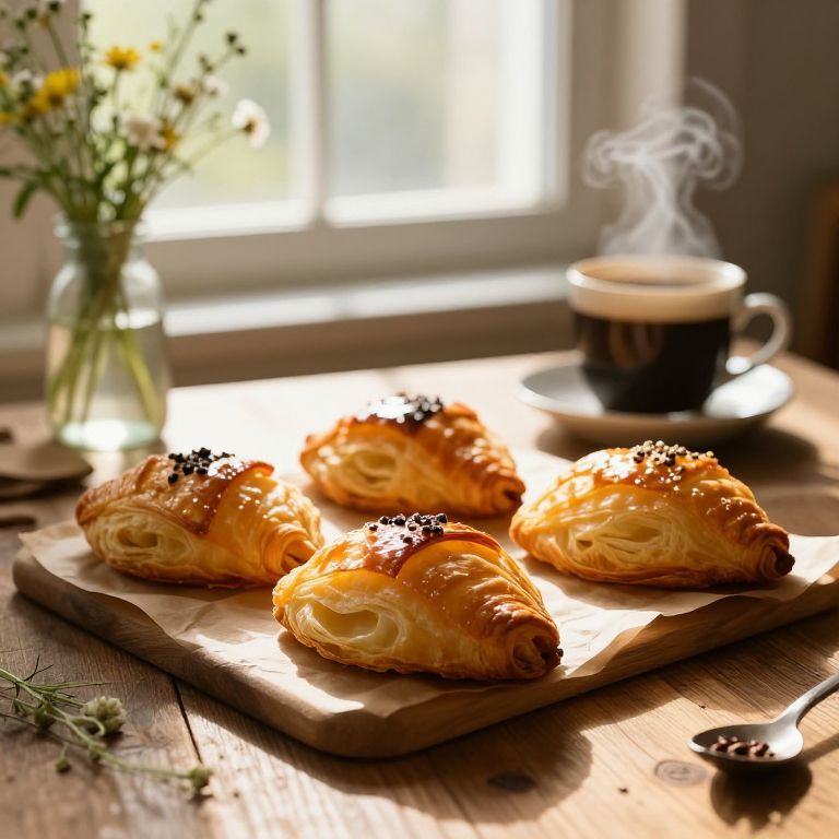 Cruasanes fresh from the oven, golden flaky layers visible, placed artfully on a rustic wooden table with warm morning light streaming through a window, accompanied by a pot of steaming coffee and a vase of wildflowers, cozy and inviting atmosphere.