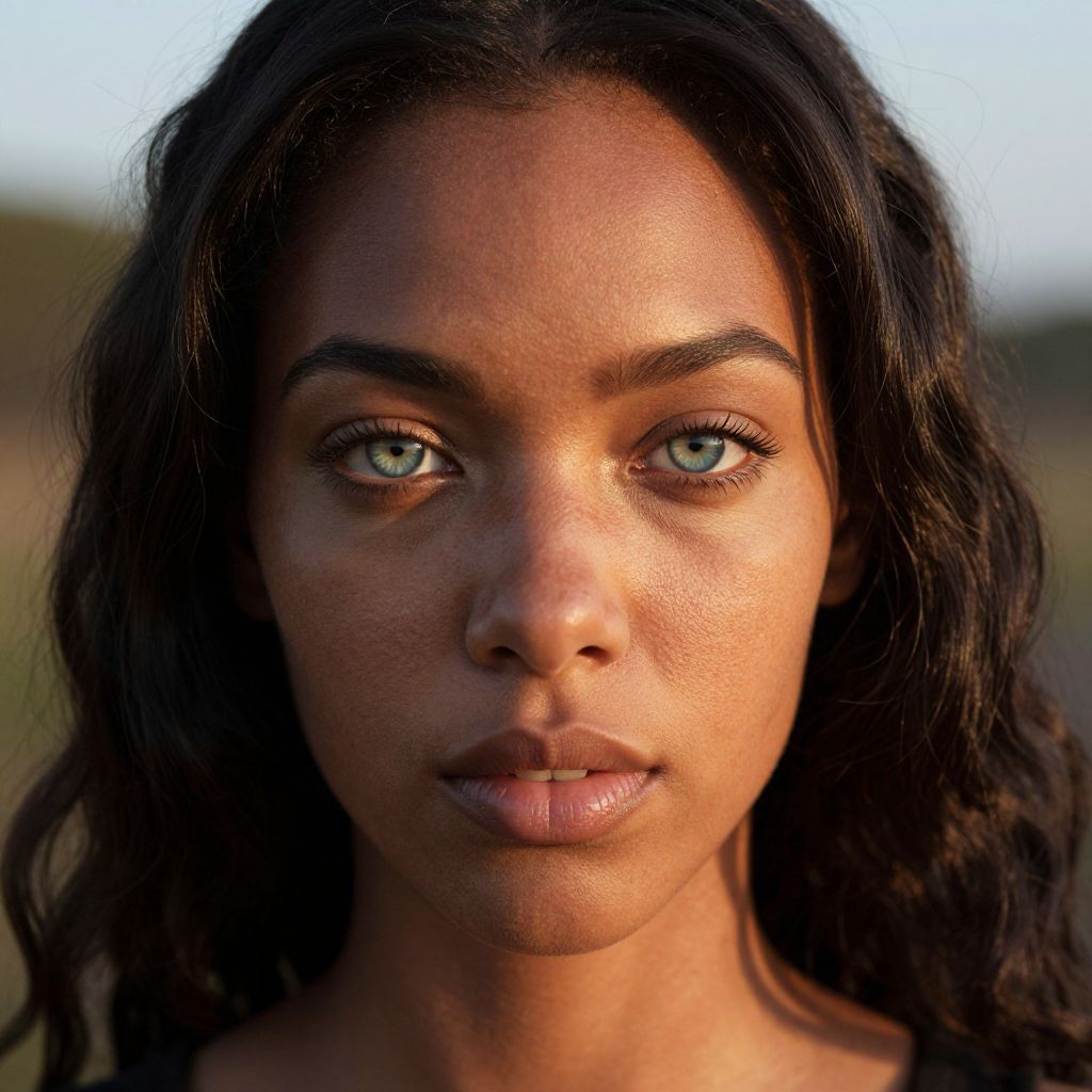 A photorealistic portrait captures the transparent gaze of an African woman with piercing sapphire eyes, set against smooth, fair skin adorned with delicate freckles. Her raven hair falls in soft waves down her back, framed by ethereal light that illuminates her features from an unexpected angle, exuding mystery and allure. Bathed in the warm glow of a setting sun, long shadows dance across her face, reflecting off her porcelain complexion while the background remains softly blurred. This close-up portrait highlights both her inner strength and vulnerability with striking sharpness and clarity.