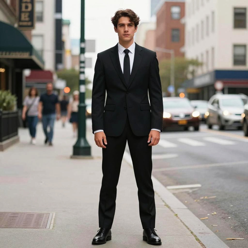 Man in Black Suit Standing on City Street