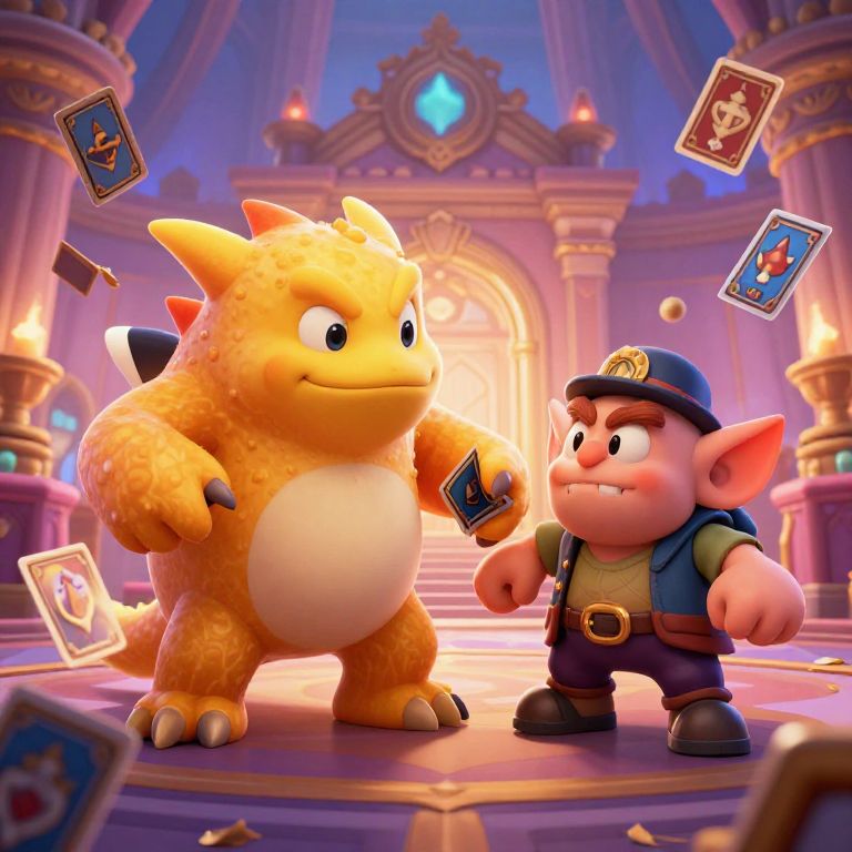 Clash Royale body swap: A dynamic, cinematic shot of a Lava Monster and a Goblin experiencing a body swap during a royal palace event, filled with floating game cards, smoke effects, and vibrant Clash Royale theming in a modern, stylized digital art style.