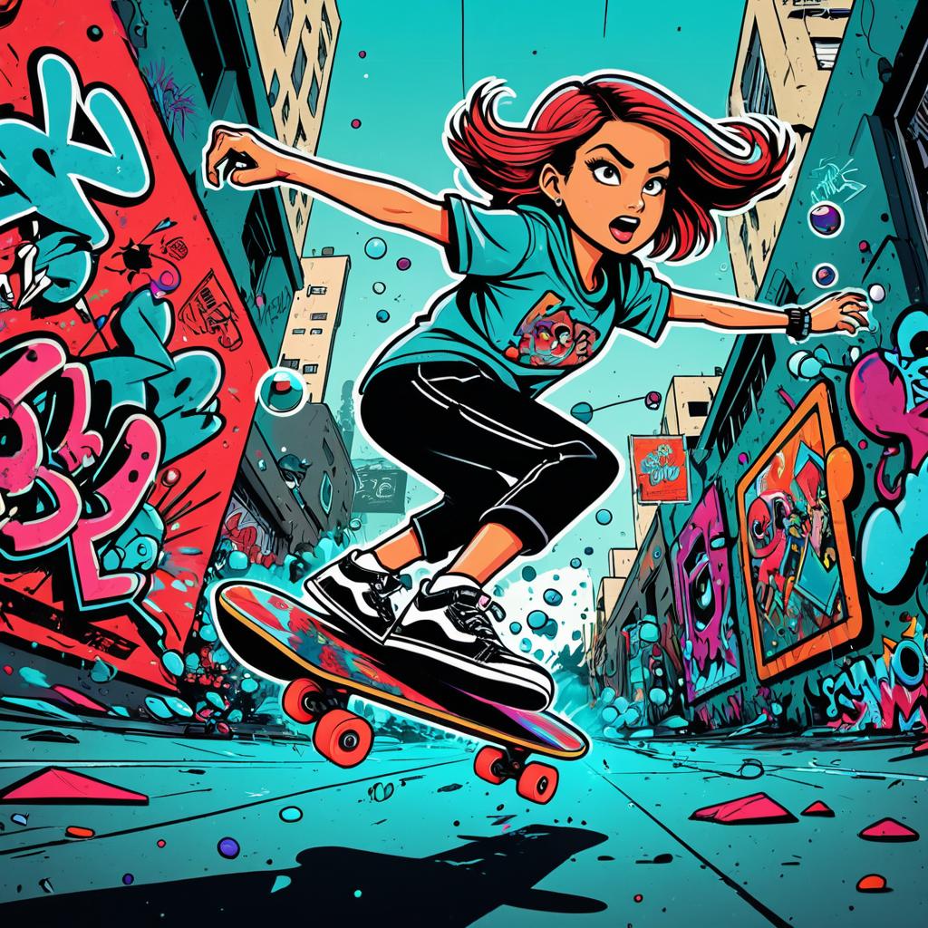 Cartoon characters of a bear playing the guitar, surrounded by quirky floating elements. The background features a bold pink and green gradient with graffiti-style details. The characters have laid-back facial features, and are accompanied by music notes and microphones. The scene has an urban fantasy feel, with a neon glow filter and animated swirling patterns. Additional effects include a pulsating color aura, floating bubbles, and comic book halftones, all blended in a street art-inspired style.