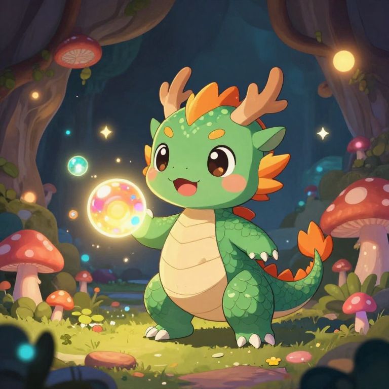 Chibi dragon perched on a mystical crystal, surrounded by vibrant forests and glowing flowers, cute oversized eyes and tiny wings, soft pastel colors, fantasy style