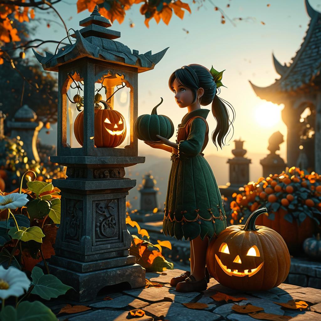 (masterpiece, best quality), moonflower, pumpkin, fantasy, stone lantern, against backlight at dusk, backlighting, (best quality:1.2), highres, amazing, 1girl, solo, plant girl, ray tracing