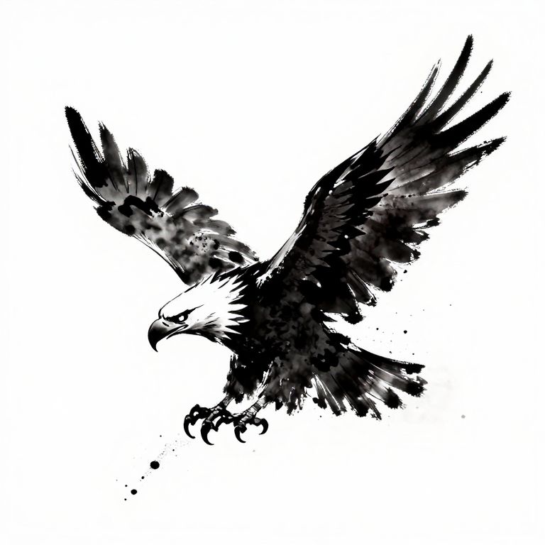 Eagle shape illustrated as a dynamic ink painting with bold brushstrokes and splatters, capturing the essence of movement and freedom, set against a minimalist white background, Asian calligraphy inspiration merging traditional and modern art techniques.