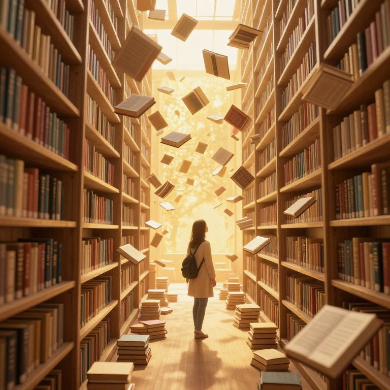 Photograph of a library aisle with golden light, books floating above, and a girl with a backpack standing in the center.