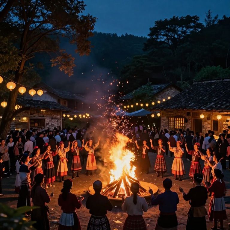 Villagefiresinging nighttime festival, lively crowd singing and dancing around a blazing fire, ancient stone cottages surrounding, lanterns hanging from trees, mystical ambiance, sparks flying in the air, rich cultural attire, cinematic lighting