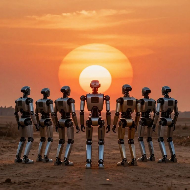 Photograph of six metallic robots standing in a desert at sunset, facing a large, glowing orange sun. Robots are silver with black joints, set against