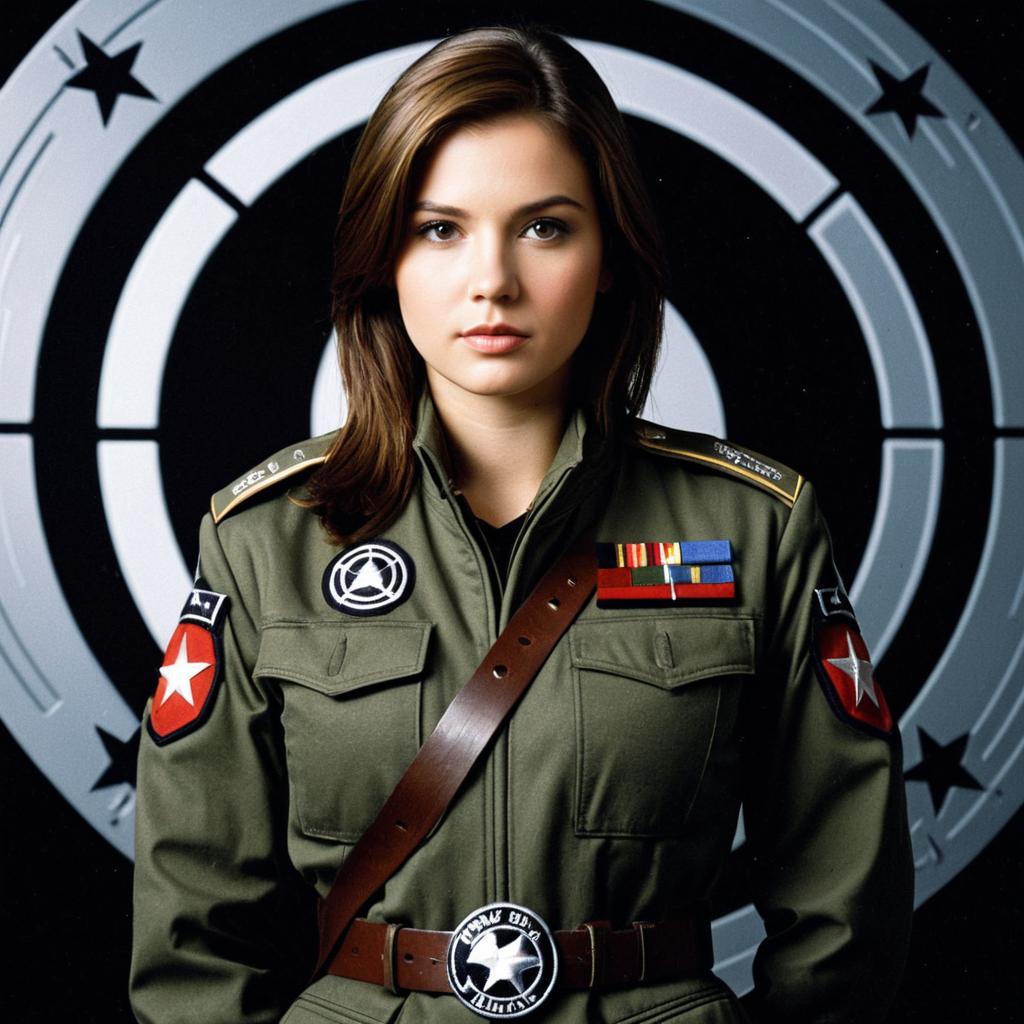 Red friday costume,1girl, solo, pants, brown hair, realistic, brown pants, looking at viewer, red background, belt, short hair, shirt, long sleeves, brown eyes, standing, red shirt, lips, closed mouth