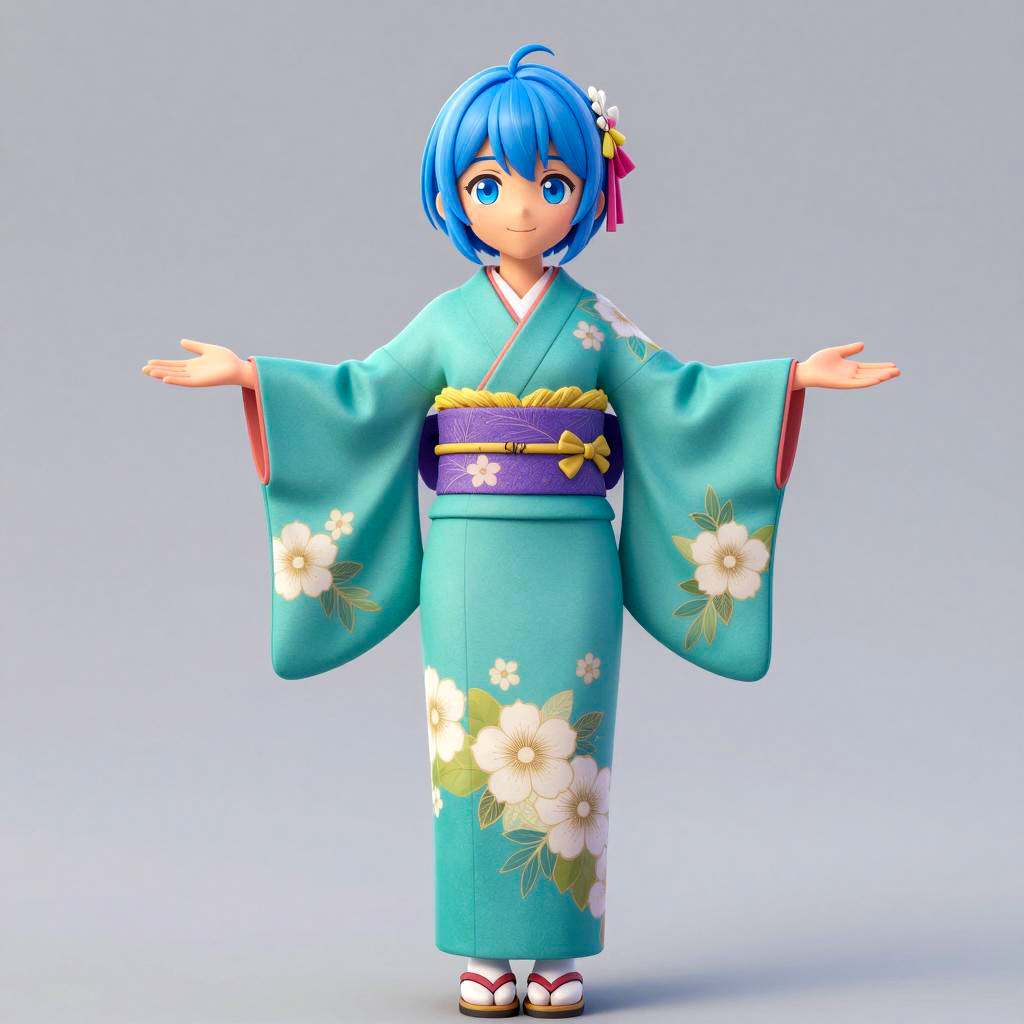 Anime girl with short blue hair, big blue eyes, wearing a teal kimono with floral patterns, wide sleeves, and a purple obi with gold and green designs. Hair accessory with pink and yellow ribbon. Arms outstretched. Gray background. 3D CGI style. Soft smile. Standing upright. Full body. Single person.