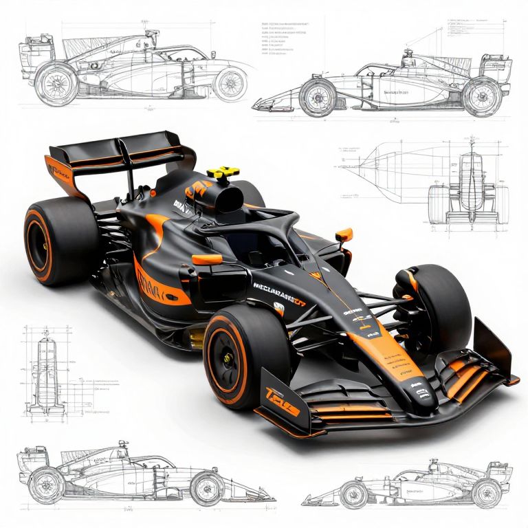 Photograph of a vivid yellow and black Formula 1 race car with red accents, detailed sketches in the background, showcasing design concepts.
