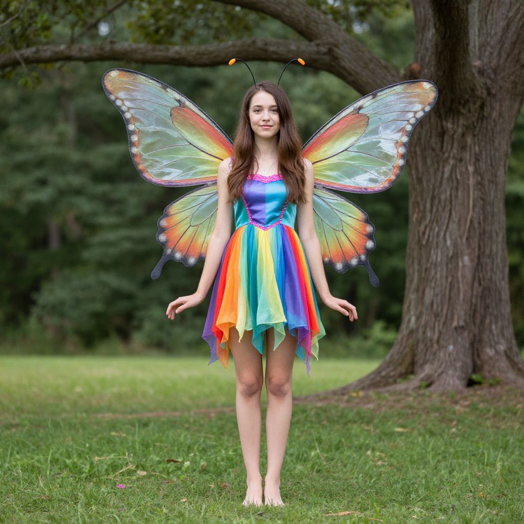 Photograph of a young woman standing in a grassy park with trees in the background. She has long brown hair and wears a strapless, rainbow-colored dress with a multi-colored, semi-transparent, winged fairy costume. Her wings are large, iridescent, and feature gradients of orange, yellow, green, and blue with white edges. She has antennae on her head and stands barefoot on the grass. The background includes a large tree trunk on the right and a blurred forested area. The image has a magical, whimsical feel.