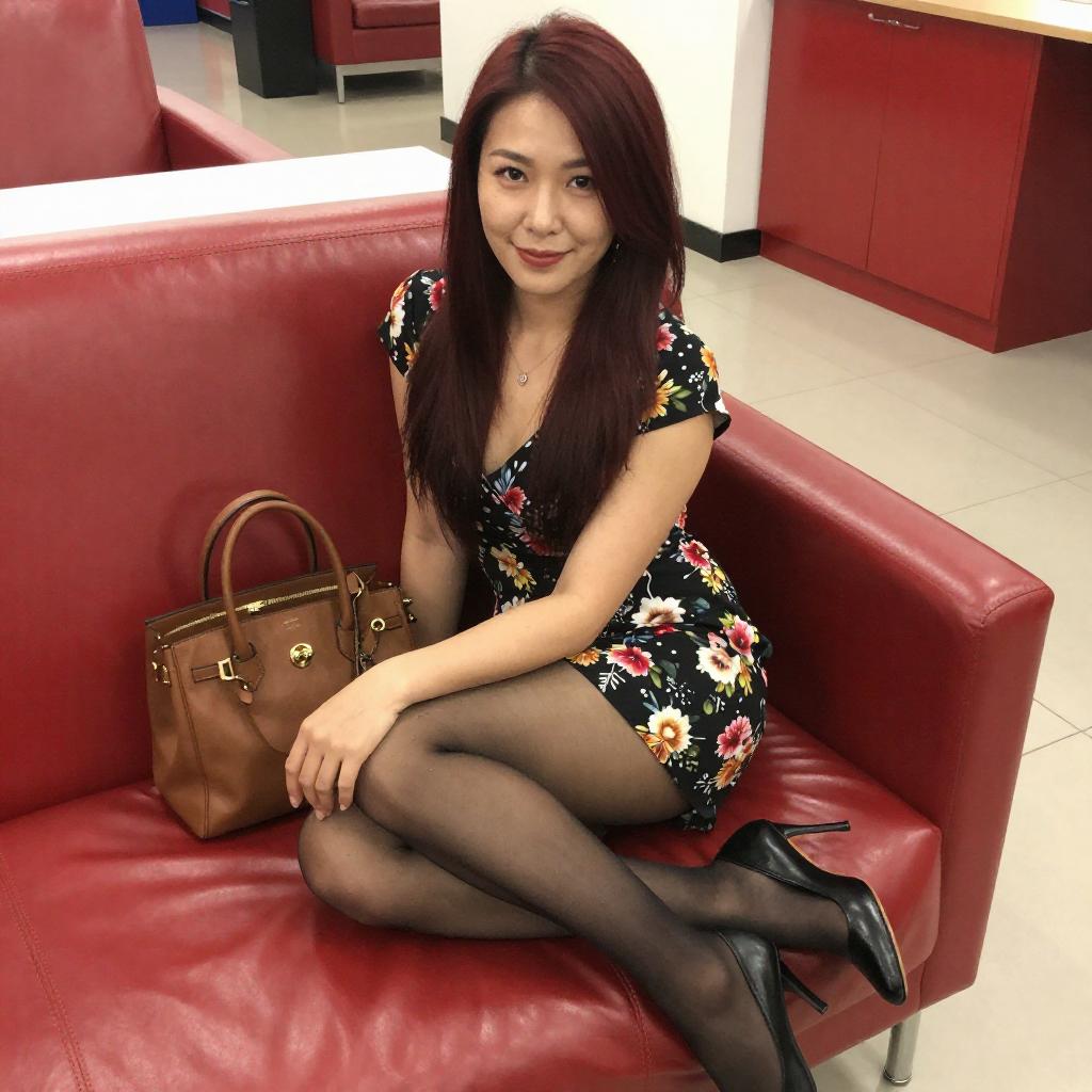 Photograph of an Asian woman with long, dark red hair, sitting on a red leather couch. She wears a floral dress, black sheer stockings, and black heels, with a brown handbag on the couch. She smiles slightly, with one arm resting on the couch's armrest. The background includes red and white furniture and a tiled floor.