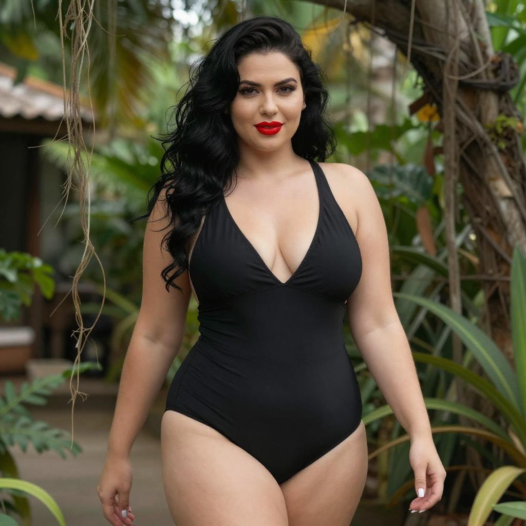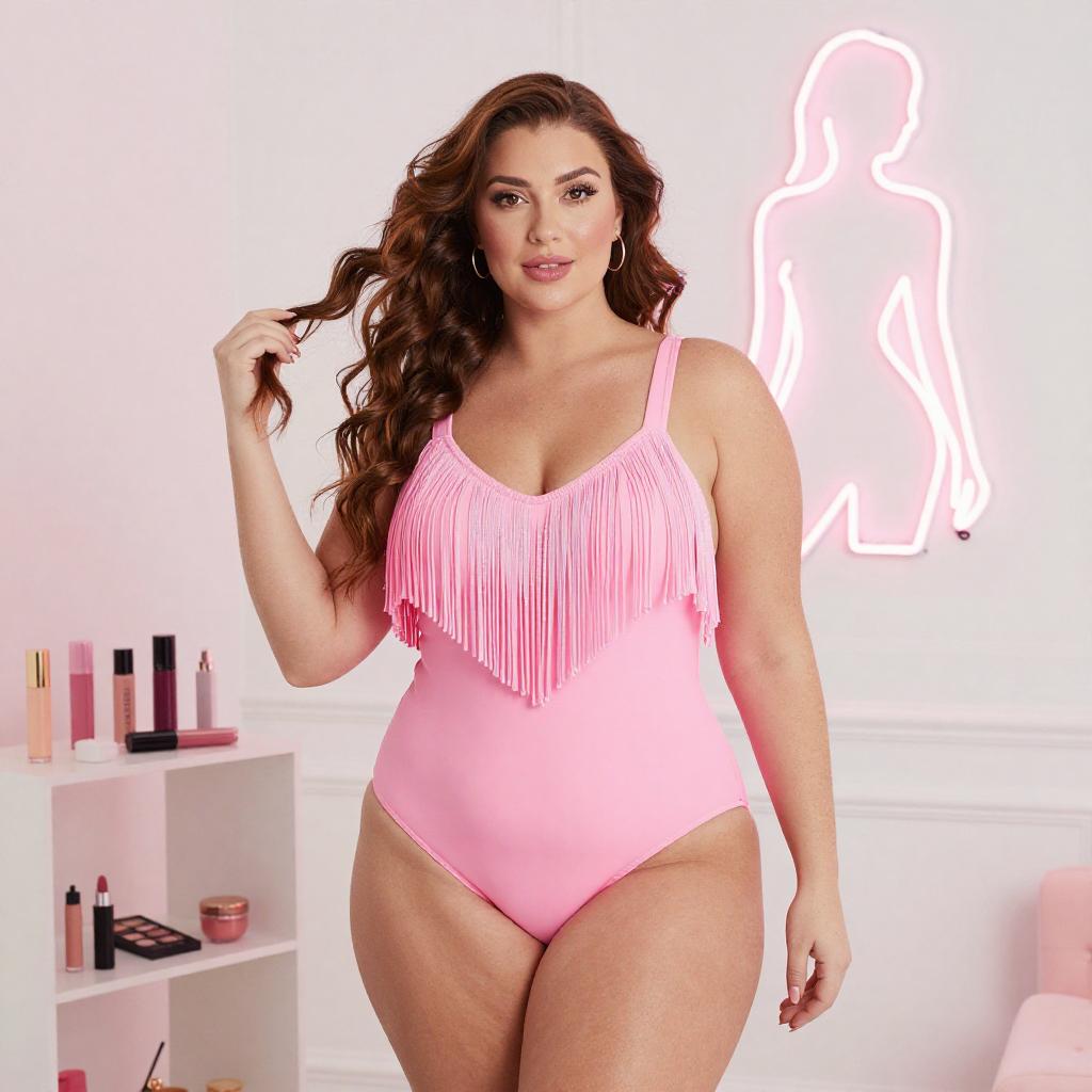 Photograph of a curvy woman with long, wavy brown hair, wearing a deep V-neck, colorful tie-dye one-piece swimsuit. She stands confidently, smiling, with one hand touching her hair. Behind her, silver sequined curtains and a cluster of metallic balloons in red, purple, and clear. A small, colorful birthday cake with candles sits on a white table to her left.