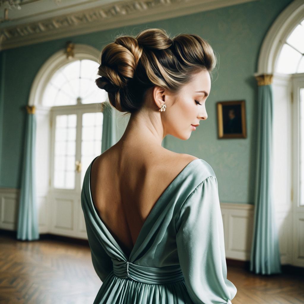Romantic Updo hairstyle on woman, wearing vintage silk dress, in wedding hall, captured in fashion editorial style with soft daylight.